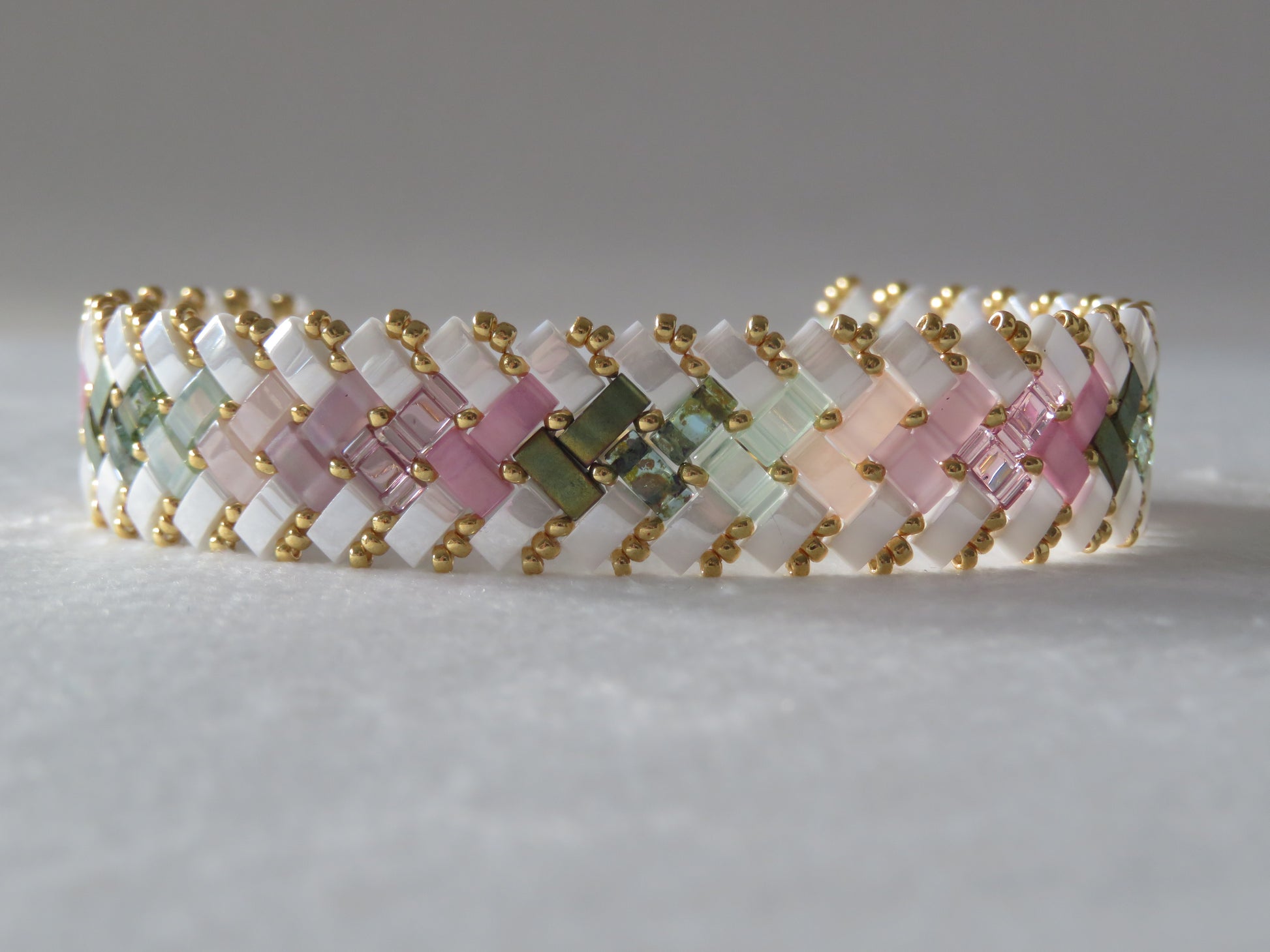 Ce bracelet 2 rangs fait main en France est une harmonie subtile de perles japonaises Miyuki roses pales et verts clairs scintillant qui captent la lumière à chaque mouvement. Chaque perle est minutieusement sélectionnée puis assemblée à la main dans mon atelier, garantissant une qualité artisanale et un design unique.